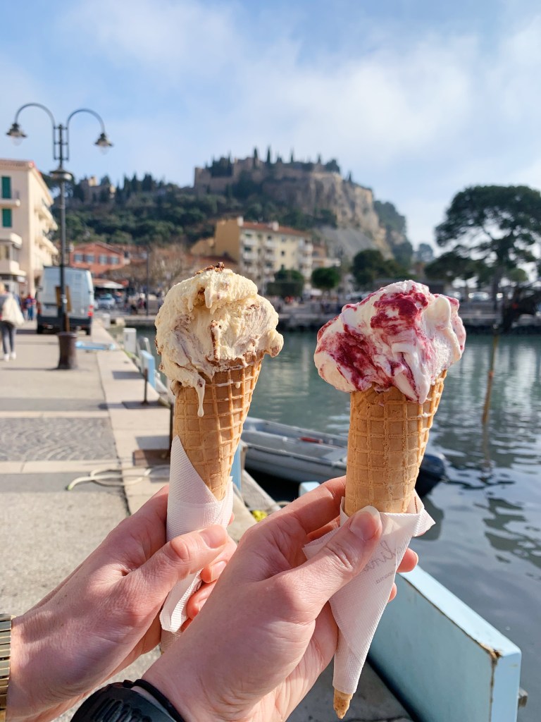 After getting back to Cassis we decided to treat ourselves after the hike. Although the tartes tropeziennes we eyed in the window of a pastry shop looked mouthwatering, we ended up going with ice cream cones. The clouds had also made their way out of the port, so we were better able to admire the harbor views. Something that caught my eye that was hidden by the fog earlier that day was a castle on a cliff overlooking the city! Helen told me that the Château de Cassis is actually now a hotel! Could you imagine spending your vacation in a castle?