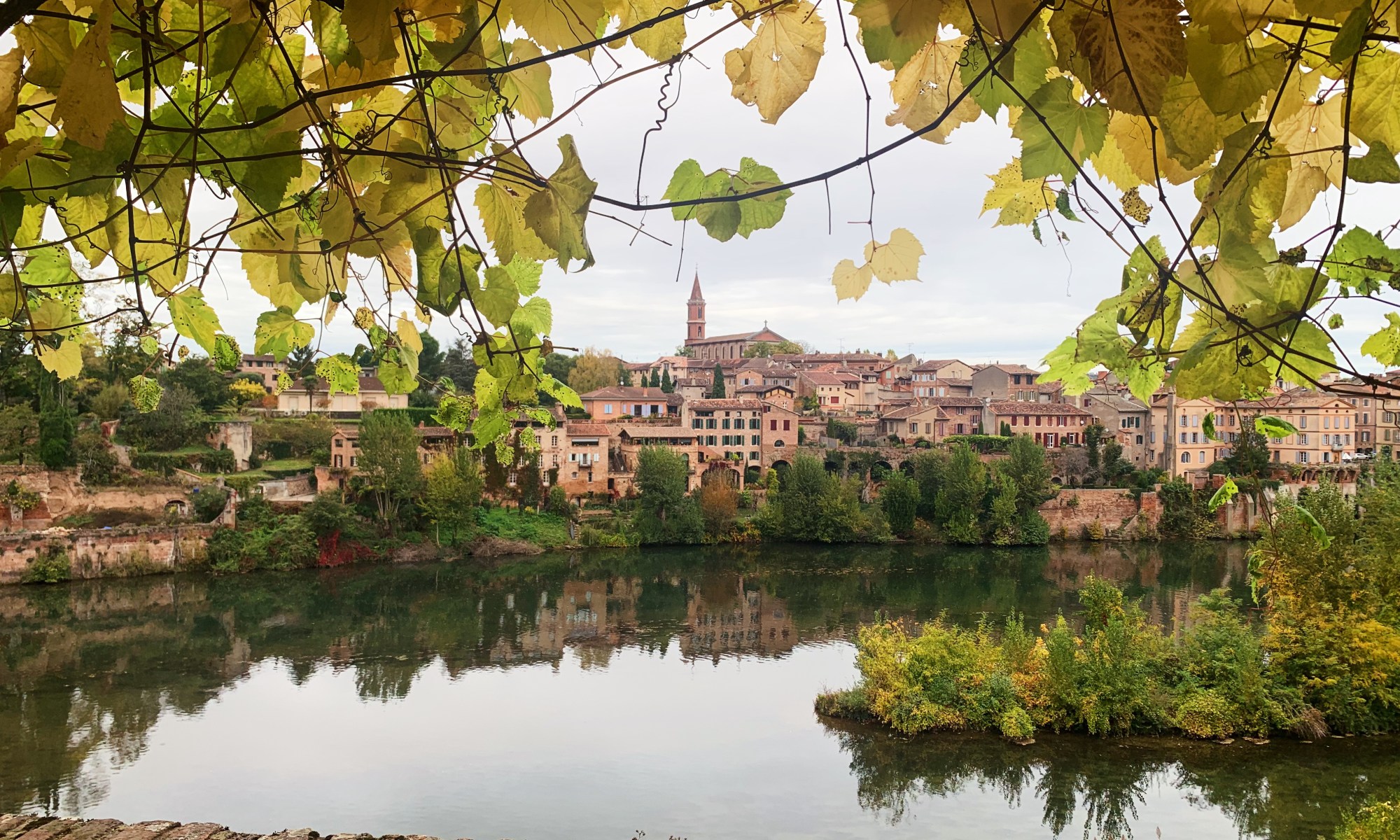 We wandered out of the Cathedral and went to look for the convent, but instead got distracted by a sign that said “les Berges du Tarn.” I am a lover of walks along riverbanks, especially in French towns, so I suggested we take a detour. We moseyed down a set of winding cobblestone steps and reached the path enveloped by green and red leaves above.