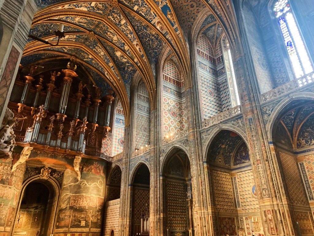 When taking a day trip to Albi, another spectacular sight you’ll notice in the town center is the Cathédrale Sainte-Cécile, which looms over the town. It made think of the towering Notre-Dame de Strasbourg, which is made from sandstone. Albi’s Southern French Gothic cathedral is made of brick however, and is the largest brick cathedral in the world!