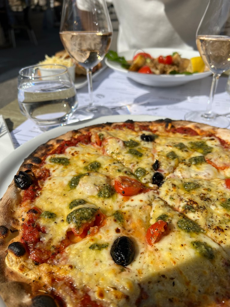 Once in Niolon, we found a table outside at the first restaurant we came across. We ordered rosé, seafood, and pizza. In Provence, it’s acceptable to put ice in rosé, even in February! It was a lovely meal after walking in the sun for a few hours.