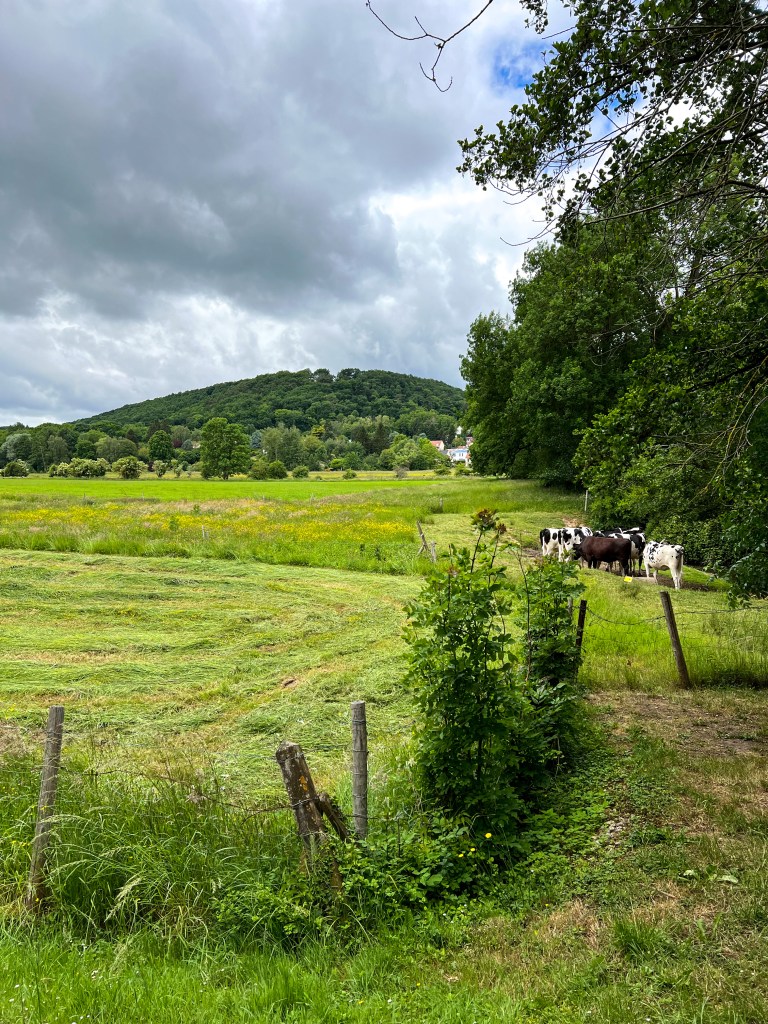 The bike path was smooth, the air fresh, and the sky full of cumulonimbus clouds as we rolled past green pastures with herds of cows and goats. To the left, we noticed a sign for the Fondation de Coubertin. We veered off our path to go check it out, but it turned out it was closed on the weekends. I’m still not really sure what it is exactly, but it looked like a châteaux. Next to the foundation is a dairy farm, which we agreed to come back to after going into town.