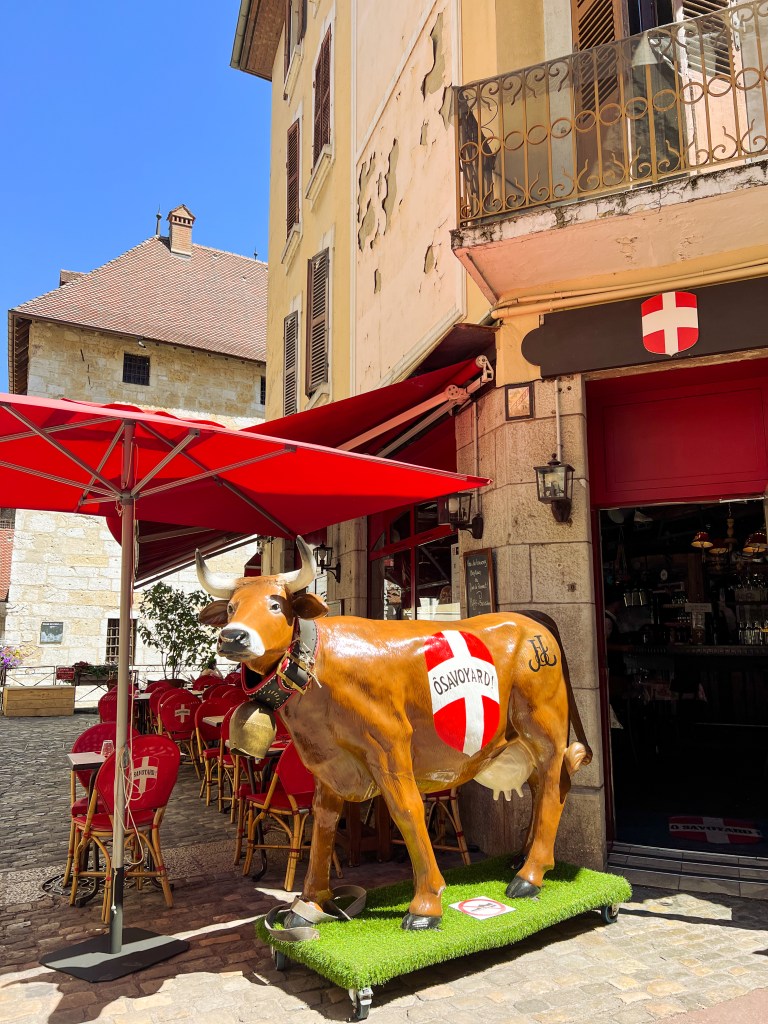 Even though it was summertime, I couldn’t leave the Savoie without having some fondue! The restaurant I ended up going to is probably the most touristy place in Annecy. In the old town, close to the Palais de l’Île, you can’t miss Ô Savoyard with its cow decked out in the regional flag. The place had good reviews though, so I thought “why not give it a try?” Since I arrived a couple of minutes before opening at 7 PM, there was plenty of space, so I sat on the terrace and had a view of the canal and the Église Saint-François de Sales. If you are going with a group of people, it’s probably a good idea to make a reservation though because the tables fill up quickly.